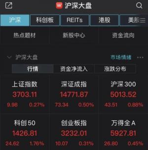 收盘时,a股三大股指集体上涨,上证综指上涨0.27%,收于3703.11点,收盘点位创下6年新高深成指涨0.5%,报14771.87点创业板指数涨0.31%,报3232.01点